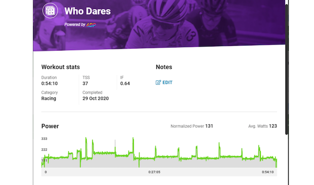 After you complete a given workout, there is useful and clear presentation of what you did, along with basic power metrics like Training Stress Score (TSS), Intensity Factor (IF), and graphs of power, cadence, heart rate, “power bests,” and the 4DP profile that was used in that workout (more on this below). This summary is handy when repeating the same workout. This is similar to most indoor training apps.