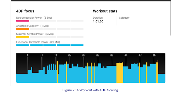 How is 4DP determined? By a combination of two SUF workouts: the Full Frontal and the Half Monty. Full Frontal directly measures the MAP, AC, and NM values with 5-minute, 1-minute, and 7-second efforts. While FTP is estimated from a 20-minute effort – a typical way to estimate FTP without a pure 40K or hour-long effort. Half Monty is a newer test that only measures FTP and MAP. And the maximal intervals are replaced with a ramp test and a sub-threshold interval. SUF’s guidance is to perform Full Frontal relatively infrequently, maybe at the beginning and ending of a season. The Half Monty is performed more frequently, with the rationale that it’s less physically and psychologically demanding. Though, in my opinion, it’s still fairly demanding. Ramp tests can be near the end, and the 20-minute “sub-threshold” effort in the Half Monty is barely sub-threshold. The sub-threshold interval keeps you at a dynamically calculated lactate threshold heart rate (assuming you’re testing with a heart-rate monitor). It’s still a pretty darn tough effort, particularly after a ramp test. SUF claims the Half Monty is the most accurate ramp-style test there is. Maybe it is, though that’s tough to verify. I’ve only done one Half Monty test so far, and it was significantly tougher and more time-intensive than a TrainerRoad or Zwift ramp test. It’s tough enough that in my own training I might consider just doing Full Frontal anyway and getting an update on the entire 4DP profile.