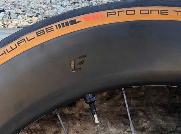 The one tire company that has manufactured to the new hookless standard is Schwalbe, and I thought it would be interesting to show you a really clean, strong, well-made hookless wheel along with what is almost certainly the fastest rolling tire today that’s made for the hookless standard. To be clear, a tire made to this standard works fine on wheels with bead hooks, just, the reverse is not true. So, a Conti 5000 TLE is not made for this CADEX wheel and Conti will tell you so. Likewise Vittoria’s Corsa Speed TL. I’d be shocked if these tires brands aren’t selling tires to the hookless standard within a year, but they’re not selling any such tires now. The other tire that rolls in the neighborhood of those tires is the Schwalbe Pro One TT, shown above on a CADEX 65mm wheel on that aforementioned Canyon Speedmax.
