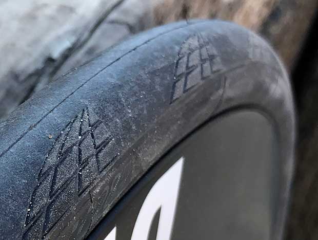 Yes, tubeless appears to roll faster than tubed, and that’s why so many top triathletes are switching. But let’s go a little further with this, because this isn’t simply about rolling resistance and durability. The bead hook strangles the tire, and that’s fine, because clincher tires are designed to be strangled. Below is the stock tire on the stock wheel on the build of the new Canyon Speedmax CF SLX 8 Disc Di2just introduced that I’m testing now. Absolutely nothing wrong with that wheel and tire combo. Here it is: