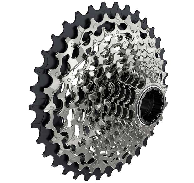 This is all the psychic freight invested in the launch of this new SRAM RED eTAP AXS 36T Max rear derailleur. It remains above the average bear's pay grade at $710, but for those who chafe at the price, remember, Force (much cheaper) is already out, and it already performs the functionality. This new RED derailleur works as a 1x or 2x derailleur, with 12-speed cassettes from 10-28T to 10-36T, and that includes the 10-33. You can use any of the AXS chain ring combos: 43/30T, 46/33T, 48/35T, and 50/37T. It’s got oversized X-SYNC pulleys and ceramic bearings and works nicely with the XG-1270 cassette (the Force cassettes are shifting to a silver finish, pictured above).