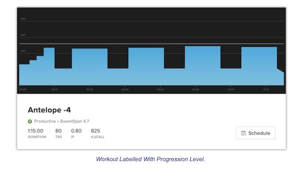 Every workout is now scored by the Progression Level. Here we see that this workout has a Sweet Spot level “4.7.” . This “4.7” is intended to be compared to the value in the corresponding “sweet spot” Progression Level. An athlete can “grow” their Progression Level by completing workouts that challenge that effort level – the higher the value attempted, the more potential progression there is. It’s a bit of “gamification” of workouts, though with far more substance than the “gold stars” received Zwift for successfully knocking out intervals.