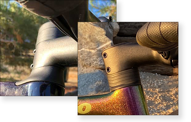 A case in point, as expressed in the details of these bikes, is the front ends of the Caledonia-5 or an Áspero-5, pictured above. While they share a common stem, the Áspero-5 has a more traditional, round terminus of its head tube while the Cal-5 has a more stylish finish.