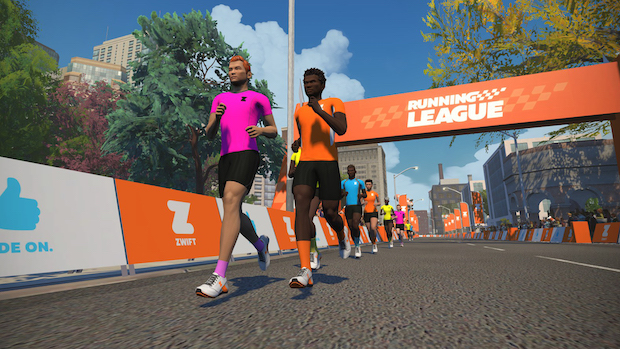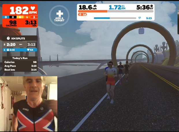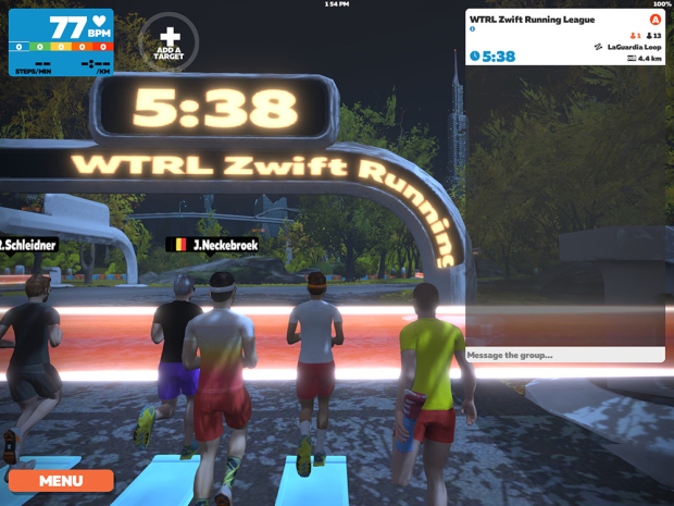 Last Friday was the first event of the Zwift Running League and Zwift had slotted in a points race. After warming up separately in UK, USA and Switzerland our team lined up about 10 minutes before 2pm in the starting pen and we made sure all our equipment was functioning. I had fully charged my Stryd to have cadence, and double checked the battery level of my 4iiii Viiiiva heart rate monitor, plus I made sure that the latest Zwift software was loaded on my iPad. My Woodway connects directly to Zwift, but I have my Stryd foot pod and a Runn as a backup in case a connection gets lost. We then wished each other a good race and exactly at 2pm EST the start clock went to zero and from then on it was full gas for 4.4km.
