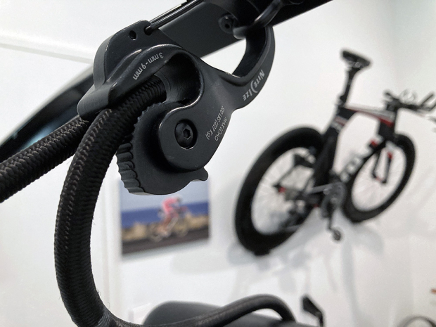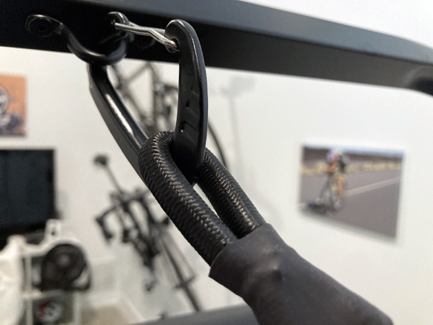 Up front on the other side of the aluminum frame the elastic cord starts with a simple carabiner, and from there goes to the roller on the right side of the neoprene shorts and then goes to the back of the aluminum frame. And yes that is an image of Sebastian Kienle on the wall of my nirvana space.