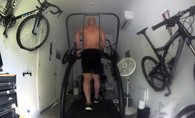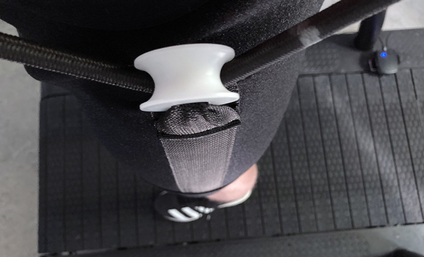 I did not want the device because of an injury, but my weekly training volume was very high, and had been so for the last 18 months. In addition to big cycling and swimming numbers, I had logged 4000 running miles in 2020, and almost 2000 running miles in the first half of 2021. My plan was to use the Lever Running system to take some load off my body during some of my heavier weeks. The package arrived in early June just before my Black Mountain Monster 6-hour race and as luck would have it I soon after did indeed get injured with a patella stress fracture. I however managed to get in a few sessions before the injury and then was able to use the Lever Running unit just like Seb Kienle as I tried to take it easy and get healthy again. Once I was able to put some load on the knee I mostly ran or power walked on the treadmill with a reduced weight of 15-30 pounds. I however rarely have pushed it all the way to 45 pounds. Not because it isn’t useful, but because you can feel the difference much sooner. Basically a large aluminum frame that sits on the arms of the treadmill suspends an athlete on that treadmill, and in order to make that happen the athlete needs to wear specific Lever Running neoprene shorts. A thick elastic cord runs through built-in rollers on each side of the neoprene shorts and at the base of these shorts are wide integrated velcro straps that allow the athlete to tighten the shorts on the legs to prevent a possible wedgie.