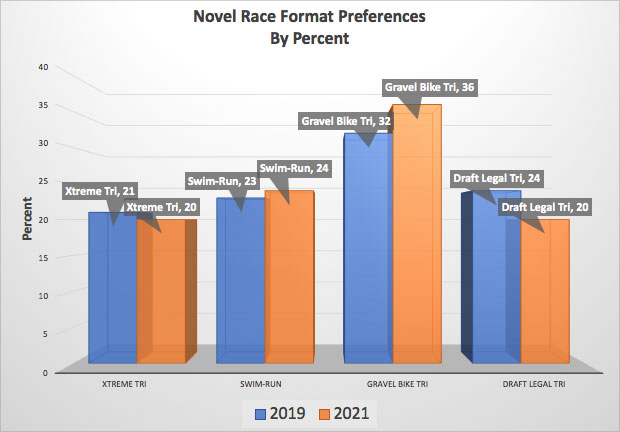 What changed over the last 3 years? Gravel Triathlon gained a little ground on the others, now polling at 36 percent. Swim-Run and Xtreme Tri remained basically unchanged, and Draft Legal tri lost a tad, falling from 24 percent to 20 percent.
