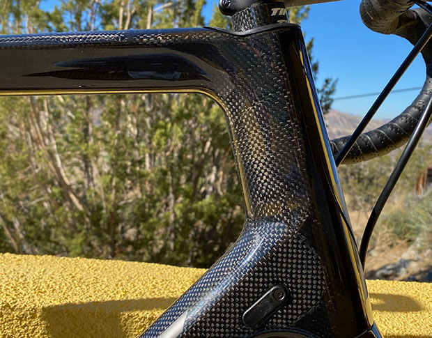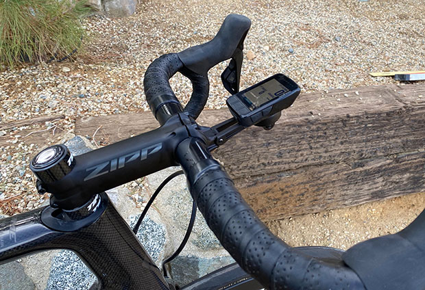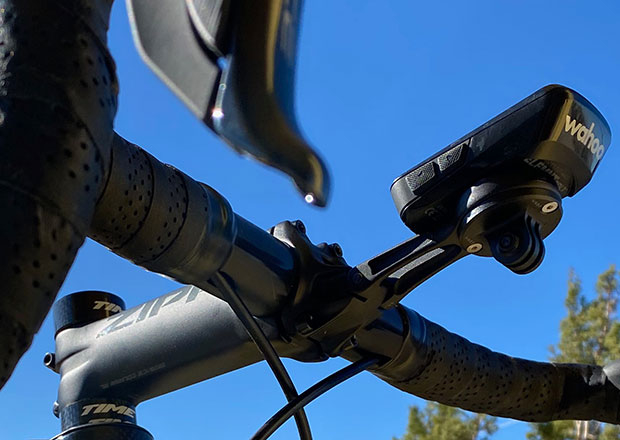 There are 172.5mm cranks on this bike, 52×36, and 11-30 in the back, 12 speed. The saddle and the handlebars are PRO, which is a Shimano brand. For the stem I chose Zipp Service Course SL, specifically because I like the Zipp QuickView. It’s my favorite mount for head units, and another good reason for choosing a frame that takes a standard stem. The QuickView is a faceplate that mates with certain Zipp stems. On that mount is a Wahoo ELEMNT Bolt, which I had, and it was hard giving that up. I have a ROAM that I use most of the time, so I’ll survive.