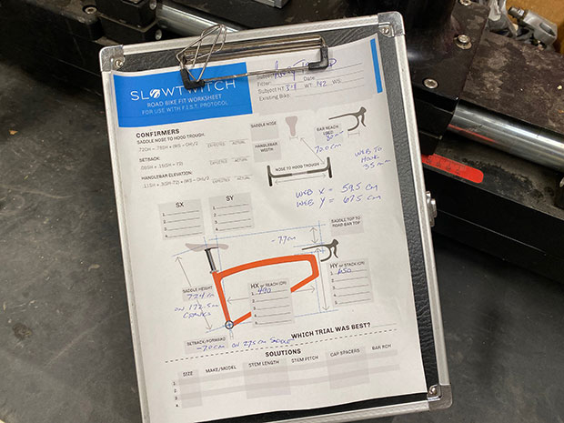 Andy has a saddle height – saddle top to BB center – of 77.5cm, on a 5’11” frame. I’m riding a saddle height of 75.5cm on a 6’2” frame. That means, all things equal, I need a bike that’s a bit longer in reach, and lower in stack. Long and low. If that’s what’s right for me it can’t be right for Andy. He ended up with a pretty conventional fit, but he just needs a taller, narrower frame because of his morphology.