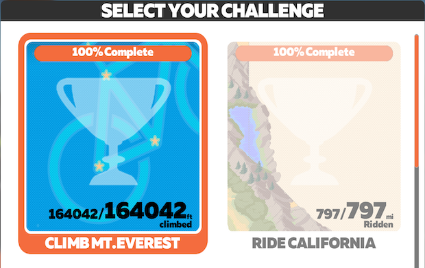 While you are working on completing the Wahoo Climb Mission, you may as well also work toward unlocking the Zwift Concept Z1 Bike (a.k.a. Tron Bike). In order to do so, you’ll need to select the Climb Mt. Everest challenge in the menu. It’s not the easiest option to find in the menu, so look for the Ride California logo in the menu, which is the default selection.