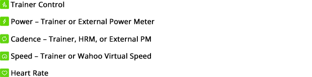 Your next step is to choose the device from which SYSTM will get power, HR, speed, and cadence. Wahoo does not offer power matching to an external power meter because smart trainers advances led to far more accurate power readings than when the original power match concepts evolved. In fact, SYSTM’s support team recommended that I do not even pair my power meter to SYSTM and instead use the trainer’s power. Additionally, Wahoo highly recommends that you use Wahoo Virtual Speed instead of a speed sensor in your trainer or wheel. (More on that below.) You click each icon to switch it on or off for its respective device, and an icon can only be active for one device.