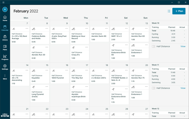 The workout calendar above is my training plan for this review: Multisport Race Prep for an Ironman 70.3 in the spring. (I started my actual plan in January, but I deleted and recreated plans for this review, so this is a re-creation.) This plan is High Volume with 3:1 progression, and I declined the options for strength, yoga, and mental training. The default plan starts on a Monday with its long ride on Saturday and long run on Sunday. The other bikes are Tuesday, Thursday, and Sunday. The swims are Monday, Wednesday, and Friday. The runs are Tuesday, Thursday, Saturday, and Sunday. This is where you may encounter a gap that was a challenge for me.