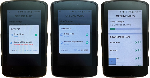 The obvious step, that I initially forgot, is to download the map updates. That is not automatic. There is a second selection next to each map for its companion heatmap data. The additional heatmap maps I downloaded were about 25% of the main map’s file size, so that might impact you if you are downloading a continent. With 32GB of total storage, you probably will not fill up your device with heatmap data.