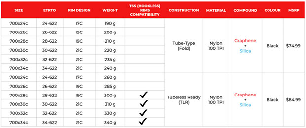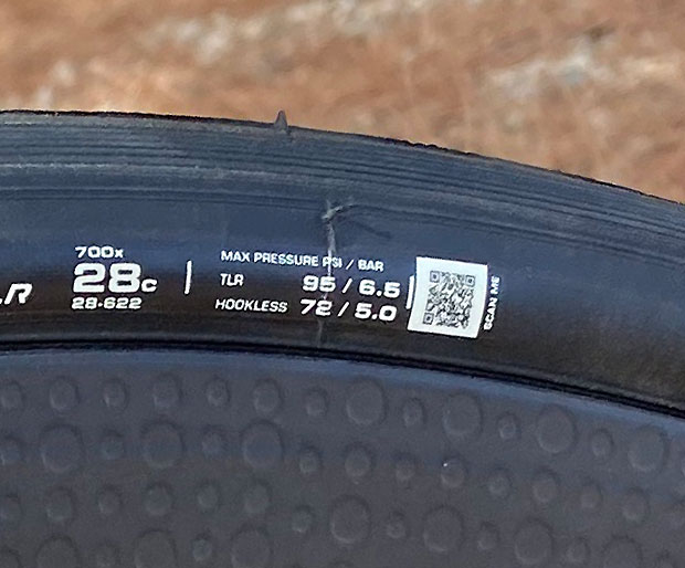 The tubeless version is made in widths from 24mm to 34mm, in 2mm increments (see that in the pricing image below). All sizes other than the 24mm and 26mm widths can be ridden on both hooked and hookless rims. One thing I appreciate that Vittoria has done is embed the max tire pressures for both hooked and hookless use in the sidewall (above), and they’re both printed on the heat stamp (below).