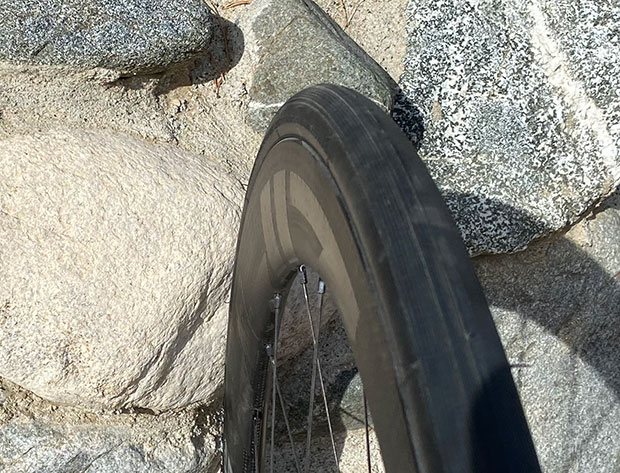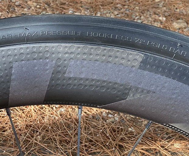 About the aero performance, I wrote in the opening paragraph that it “models well aerodynamically.” I chose my phrase strategically, because I don’t know how well it performs. I only know that Slowtwitchers are – until convinced by new and compelling data – devotees to the Rule of 105, which says that the width of the outside of the rim should be 105% (or more) the width of the tire. When ridden in its 28mm size this tire just about exactly hits that 105% threshold on most of the rims I’m riding now, from ENVE, Zipp, CADEX, Shimano, HED, Bontrager, because all these wheels – hooked and hookless – are built with 22.5mm to 25mm internal bead widths. These wider rims all are about 30mm to 32mm wide on the outside (to my calipers), and this tire inflates to about 29mm in its 28mm size.