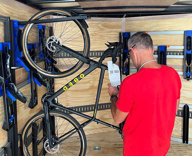 THRU has already been shipping bikes boxless and complete for Quintana Roo and other brands. The heart of THRU’s tech is its racking system both in-truck and in-house at THRU’s client locations. Their system allows bikes to travel without any disassembly (e.g., front wheel removal, photos are included here). This saves, according to Lauzon, a significant amount of time, substantially increasing gross profits. THRU reports it has picked up business this week from manufacturers otherwise left with no boxless alternative.