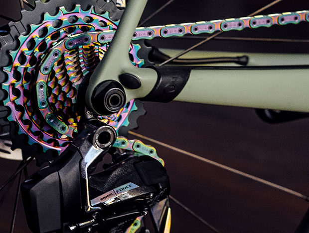 There is a nickel-chrome finish to cassettes but the real show stopper is the rainbow chain and cassette options and take it from me: If you really want to appeal the girls (or guys) you will outfit your bike with this. The two things my wife digs about me most (I suspect) is my ability to work on her bike; and my Eagle rainbow cassette. Fair warning though: the rainbow cassette – while launched now – is only available at the RED level, which means $$$.