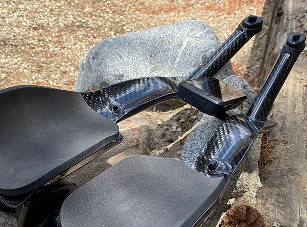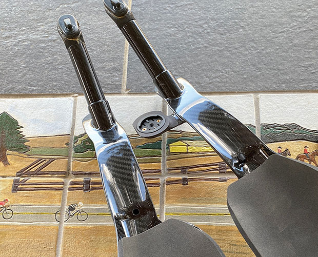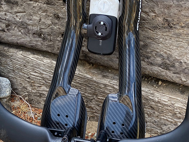 You see the computer mount. I normally ride with a Wahoo ROAM but I show this bar with a Garmin as well and these big Garmins like the 1030 don’t quite fit (when you try to get the head unit on and off the mount). There is a pedestal available for this bar, where the head unit sits higher and that will certainly make these large head units fit. But I have hopes for a BTA system with these bars and if my hopes are realized I wouldn’t want to create a new clearance problem, so I like the head unit right where it is.