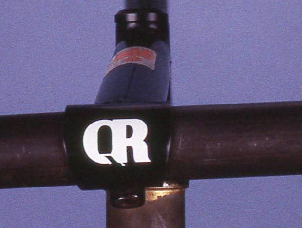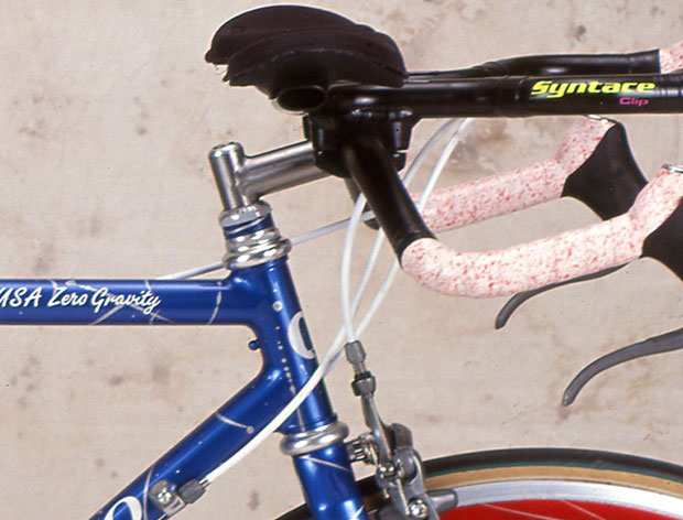 What I mean is, you threaded the handlebar through the clamp on the stem and if the handlebar’s curves made it unthreadable the trick was to take out the bolt that pinched the stem clamp together, thread it backwards, and place a penny as a stopper. That expanded the stem clamp. It was a pain in the arse. (The image above is from the stem on our testing rig back in the early 1990s and you can see the pinch bolt on the underside of the handlebar clamp.)