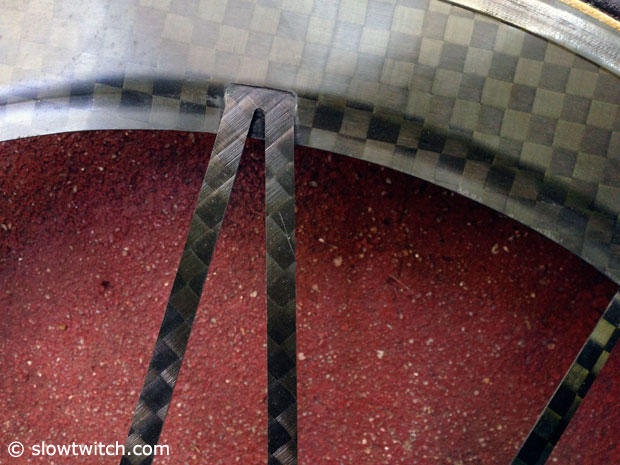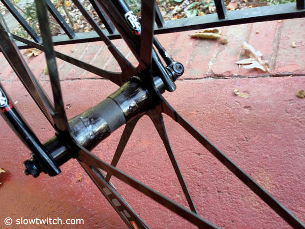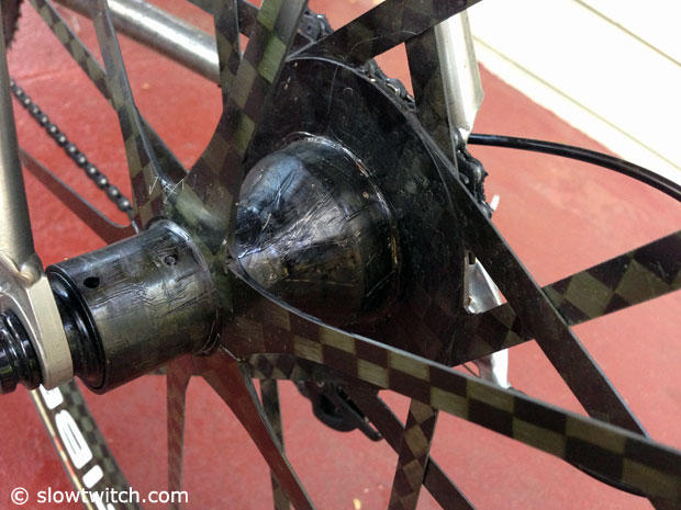 A closer look at the front hub of the Mad Fiber wheels and how the 12 bladed spokes up front attach to it.