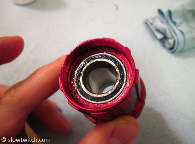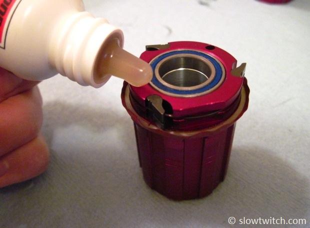 To lubricate the pawls, Zipp recommends a light oil – not any sort of thick grease. Grease would cause the pawls to stick down, and the hub wouldn’t work. I’m using DuMonde Tech Freehub Oil: