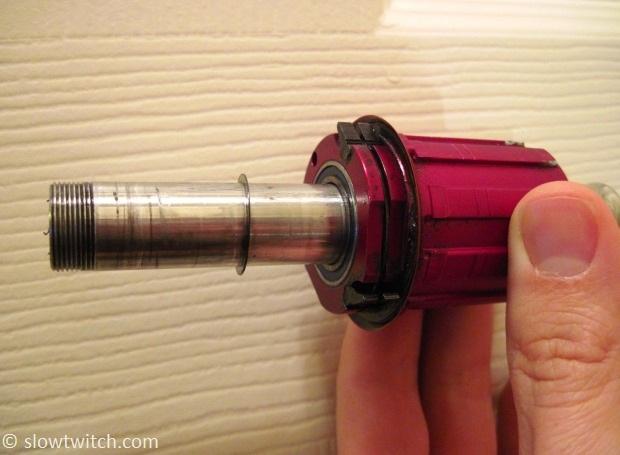 Next, I grease the axle. Some people are axle greasers; others aren’t. I’m usually an axle greaser. It lessens the chance of problems down the road, like creaking and corrosion. Slide the axle in the freehub, and don’t forget to reuse the small .25mm shim.