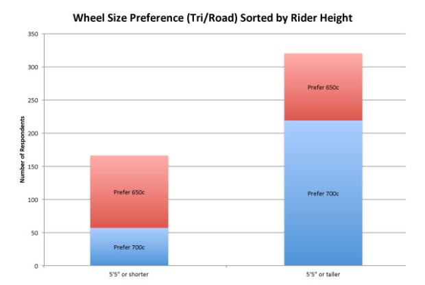 Riders shorter than 5’5″ who have experience riding both wheel sizes are twice as likely to prefer road or tri bike wheels made 650c wheels.