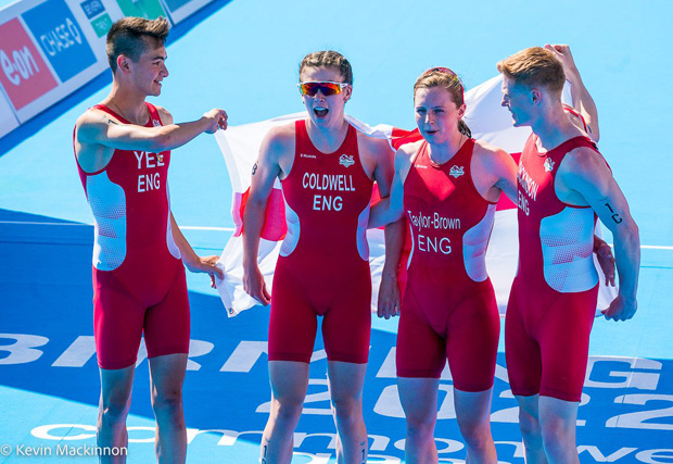 Georgia Taylor-Brown takes finish tape after set ups by Alex Yee, Sophie Coldwell and Samuel Dickinson. England Tops Team Wales by 46 seconds.