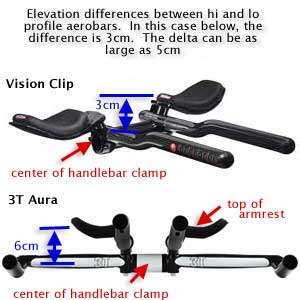 Yes, it's true that a frame might trend toward long-and-low, or narrow-and-tall. But that trending is modified by the geometry of the aerobar you put on the bike. Consider two aerobars: a 3T Aura, and a Vision Clip. The 3T bar has armrests that sit 6cm above the centerlne of the pursuit bar (where it passes through the stem's handlebar clamp). The Vision's aerobar pads sit only 3cm above the handlebar clamp.