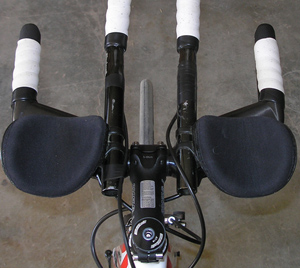 Furthermore, for the one legitimate purpose pursuit bars have that extends beyond braking and cornering, narrower is better. Some (maybe most) folks use the pursuits during seated climbing. I typically do not, and one reason is the very (to me) unergonomic placement of the pursuits. One inescapable aspect of tri bikes is the forward placement of the rider's weight. That can be done because the rider rests his upper body skeletally on the front of the bike. Once you're on your pursuits, you're not doing that. Now, to be sure, the effect is lessened, because once the slope pitches up the rider's weight is now incrementally moved off the front of the bike and back onto the saddle.