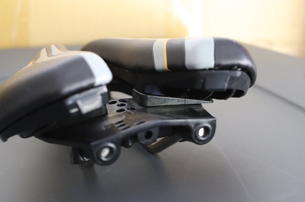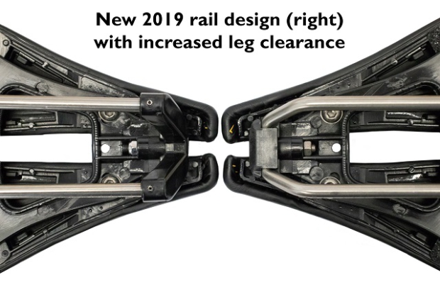 I did have one problem with the first version of the ShapeShifter that I received: my legs tended to rub the saddle rails from time to time. The rails were joined at the front by a wide bracket, which could actually be wider than the seating pads if adjusted to be narrow. They since sent a 2019 version of the saddle to me, with a revised rail design that eliminated the problem for (see image below).