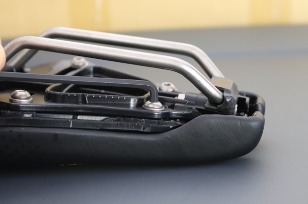 As pictured below, adjustment is made possible by four titanium bolts on the bottom of the saddle: