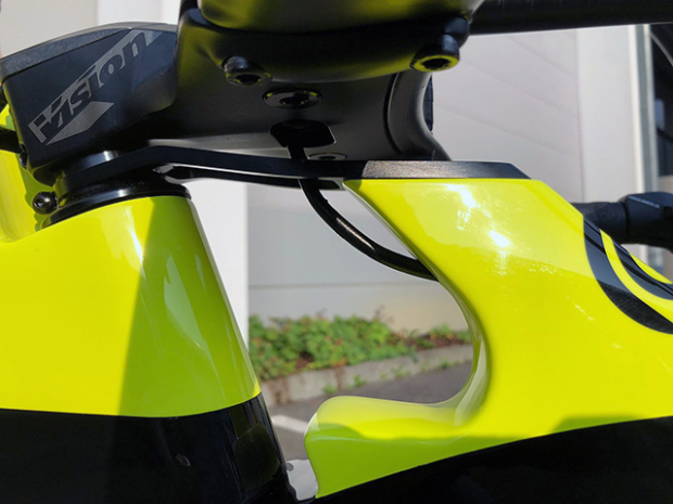 Here is a closer look at the point where the unique Ceepo Shadow-R is connected to the headtube. The brake cable also runs through structure.