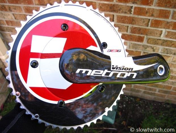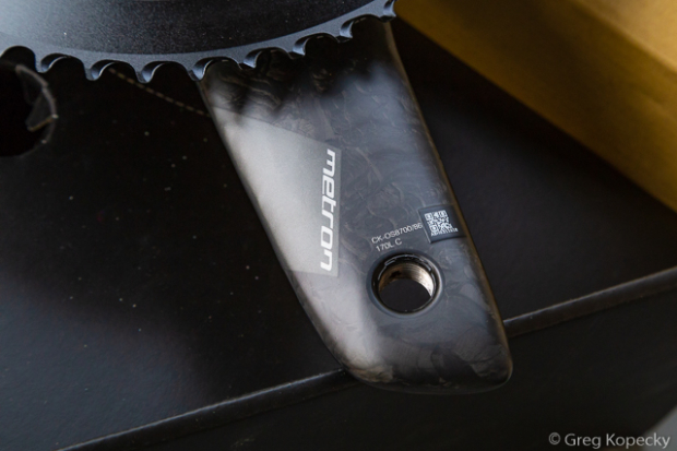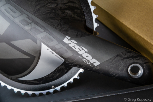 We recently got our hands on the latest aerodynamic crank from Vision, which still sells under the Metron name (this is the crank you see featured in the photos of this article). Our older version relied on a standard 130mm BCD, combined with a hybrid aluminum/carbon outer chainring. The new unit maintains the 130mm BCD, but threads the bolts into the backside – leaving a smooth face for the drive side.