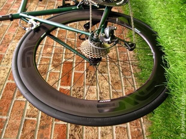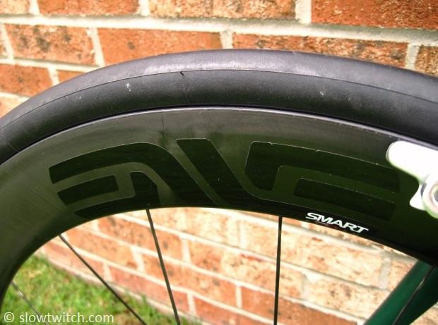 Braking quality with Enve’s grey carbon-specific pads and Shimano brake calipers felt quite good. I rank it up with my other favorite carbon rims and pads: Shimano C50/C75 tubulars with Shimano blue pads, and Zipp carbon clinchers with their gray Tangente pads. Initial bite with the Enve’s was a tad too strong for my taste, but overall power was great, and there was no shudder or squeal of any kind. I gave the brakes a very fair shake at Michigan Mountain Mayhem, a mega hilly ride (up AND downhill) with distance options up to 125 miles.