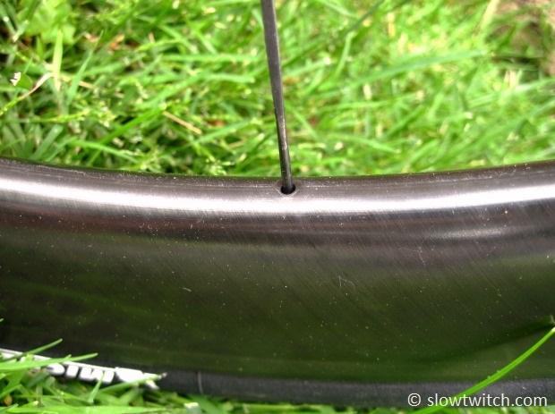 Enve uses molded-in spoke holes with internal brass nipples, seen above.