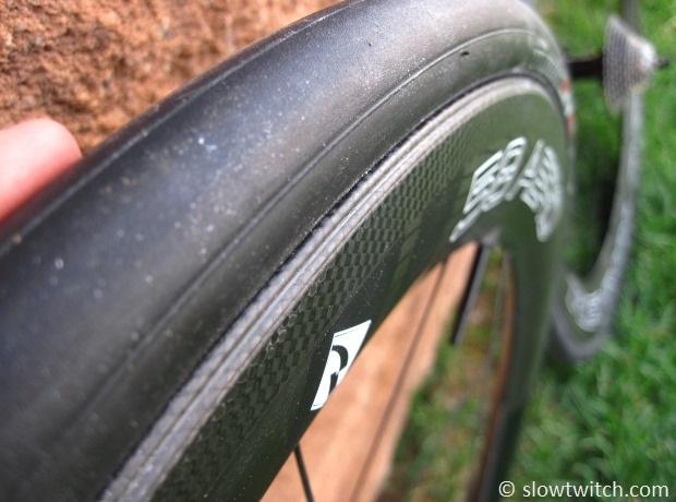 With the Reynolds AERO wheels, the last millimeter or so of braking surface is effectively missing because the ISH ‘ledge’ removes it. I had to drop the pads on my Dura Ace brake all the way to the bottom of the available range, and the pads just barely hit the rim properly. On most tri bikes designed for 23mm tires, this should not be an issue.