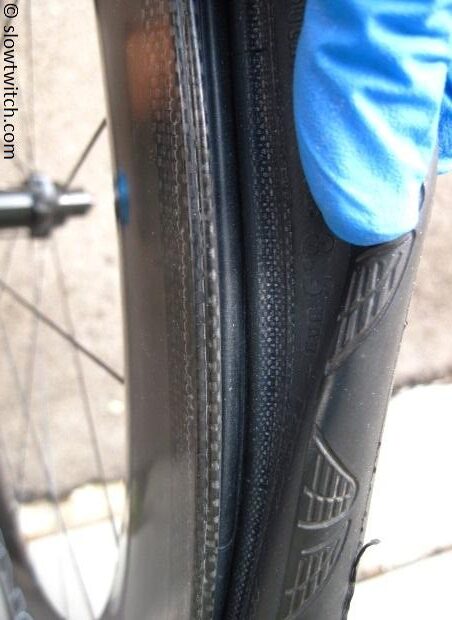 The first thing I noticed was that the tires installed really easily… as in – it was the loosest fitting tire/rim I’ve ever felt. I wondered if those tires happened to fit particularly loose, so I also threw on a 25mm Continental GP4000. It was a tiny bit tighter, but still a very loose fit.