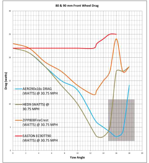 That aside, Reynolds did provide several graphs to me from their wind tunnel testing at the A2 facility in North Carolina. They claim a 3 minute, 6 second advantage over the Zipp 808 Firecrest, and a 6 minute, 54 second advantage over the Easton EC90 TT 90mm for an Ironman distance ride (assuming a constant 16 degrees of yaw):
