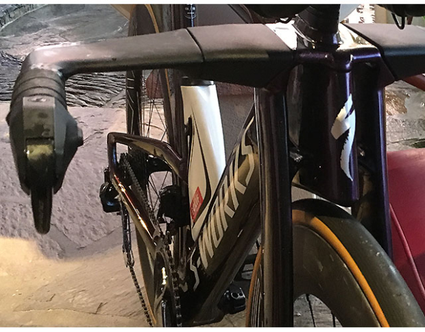 There is a mono-pedestal and this is a *thing* now in the newer, better tri bikes. Trek started it with the 2014 Speed Concept, Cervelo continued it with the P5X (likewise TriRig with its Alpha One. The nice thing about this bar – according to what Specialized told me – is that the bolts come down from the top, it’s very easy to change the bolts and pedestals for shipping or to simply change your pad height. This seems much easier to change than the Speed Concept’s pedestal.