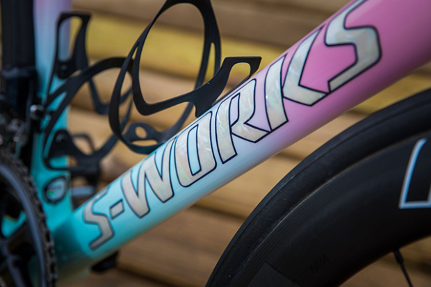 This is the very beautiful mother of pearl detail Flora Duffy mentioned on social media. The Roval CLX 50 Disc Tubular wheels have Specialized S-Works Turbo Tubular 26mm tires on them. The bottle cages are matte black Specialized S-Works Carbon cages.