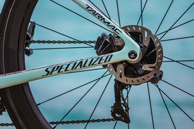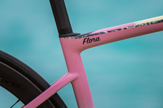 The Shimano Dura-Ace disc brakes will allow Flora Duffy to race that course in Bermuda aggressively, and when you look closer at the chain stays and seat stays you will notice even more detailed art.