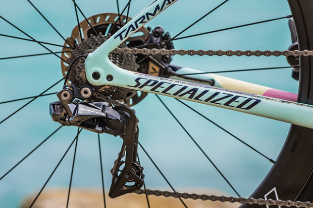 Duffy runs a Shimano Dura-Ace Di2 drive train on this Specialized Tarmac. The Shimano cassette for the course in Bermuda is 11-25.