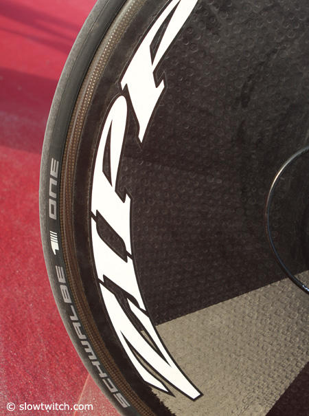 Schwalbe One tires front and back on Zipp race wheels.