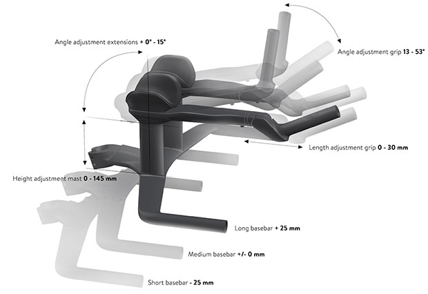 That said, there are 3 available pursuit bars, but I don’t know what they look like. Let’s say one of these pursuit positions is angled up from the stem, so that there isn’t a big drop from pads to pursuits. This would make the bike more tri friendly and while you can't easily see it the Cervelo P3X is like this: a low front end with an available V-like pursuit position. That said, if you look at the illustration below the 3 pursuit bars are not low, medium and high; they're short, medium and long. To me, this says that fore/aft is achieved largely through the choice of pursuit bar and that V-shaped up-angled pursuit is not (yet) made for this frame.