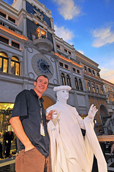 Two-time Olympic medalist Simon Whitfield holding hands with human statue by the Venetian Canals