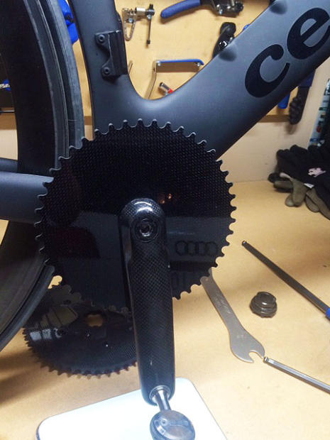– FSA cranks with custom made Fibre-lyte spiderless chain ring 46t (50t custom on the way).
