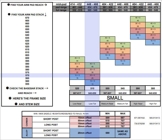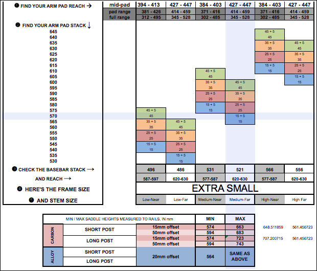 FELT IAx: This company has it’s own Excel-based calculator based on Pad XY. In an IAx, it’s a size-48 all the way, either with 10mm of pad pedestal for the aluminum aerobar or 20mm with the carbon aerobar (the model determines which bar you get).