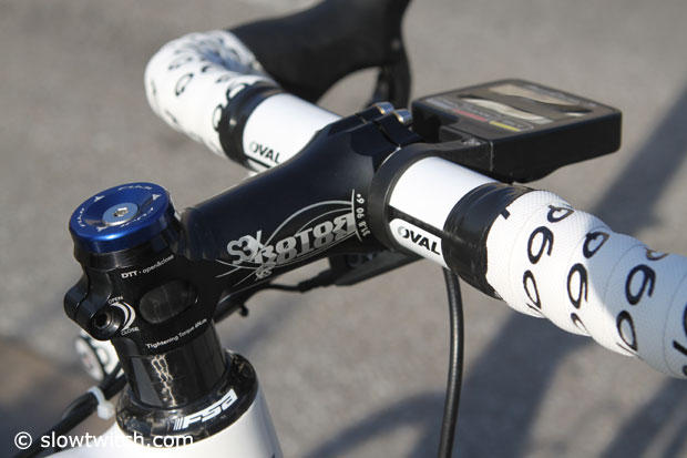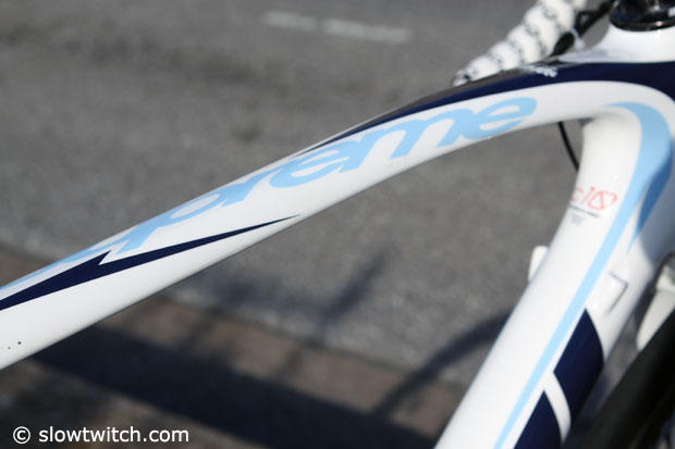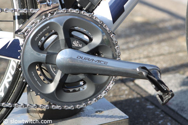 Shimano Dura-Ace SRM compact 50/34 cranks power this machine.