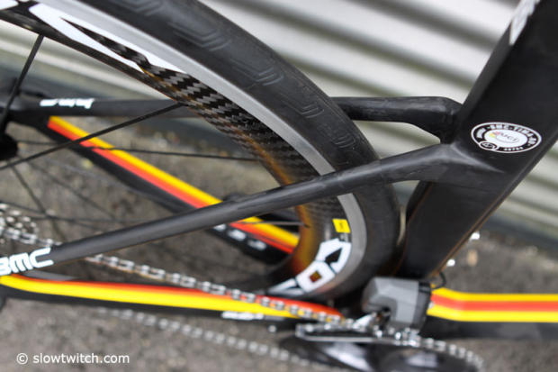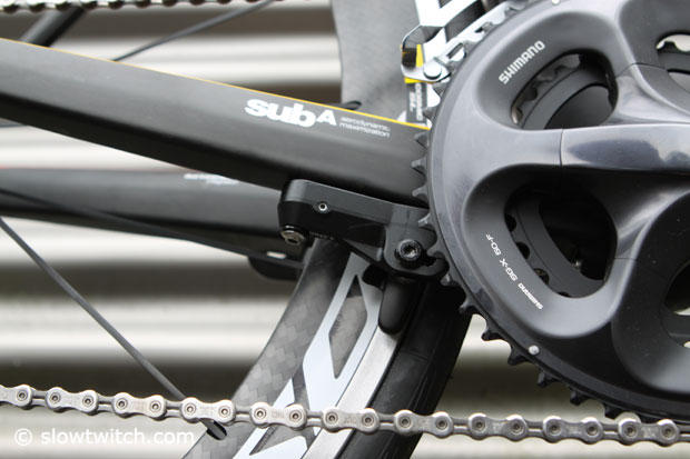 The rear brakes is tucked under the chainstays and behind the compact Ultegra crankset.